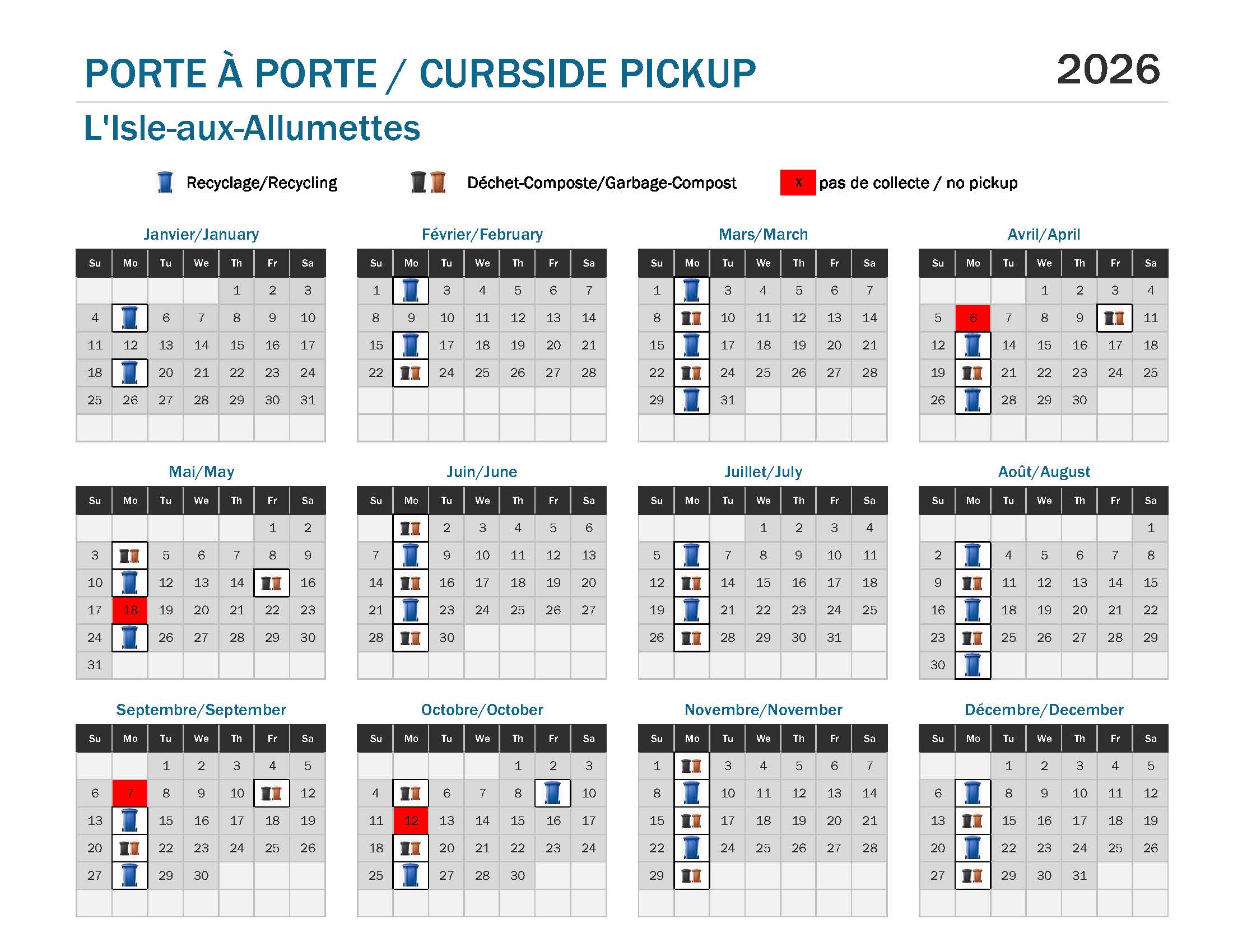 Les sacs identifiés L’Isle-aux-Allumettes ne seront plus fournis comme auparavant. Vous pouvez continuer d’utiliser ceux qu’il vous reste; toutefois, à compter du 1er avril, ils seront considérés comme tout autre sac et assujettis aux frais applicables. Les déchets domestiques seront acceptés uniquement dans des sacs transparents, les matières organiques et le compost dans des sacs en papier, et le recyclage dans des sacs transparents ou sans sac.
