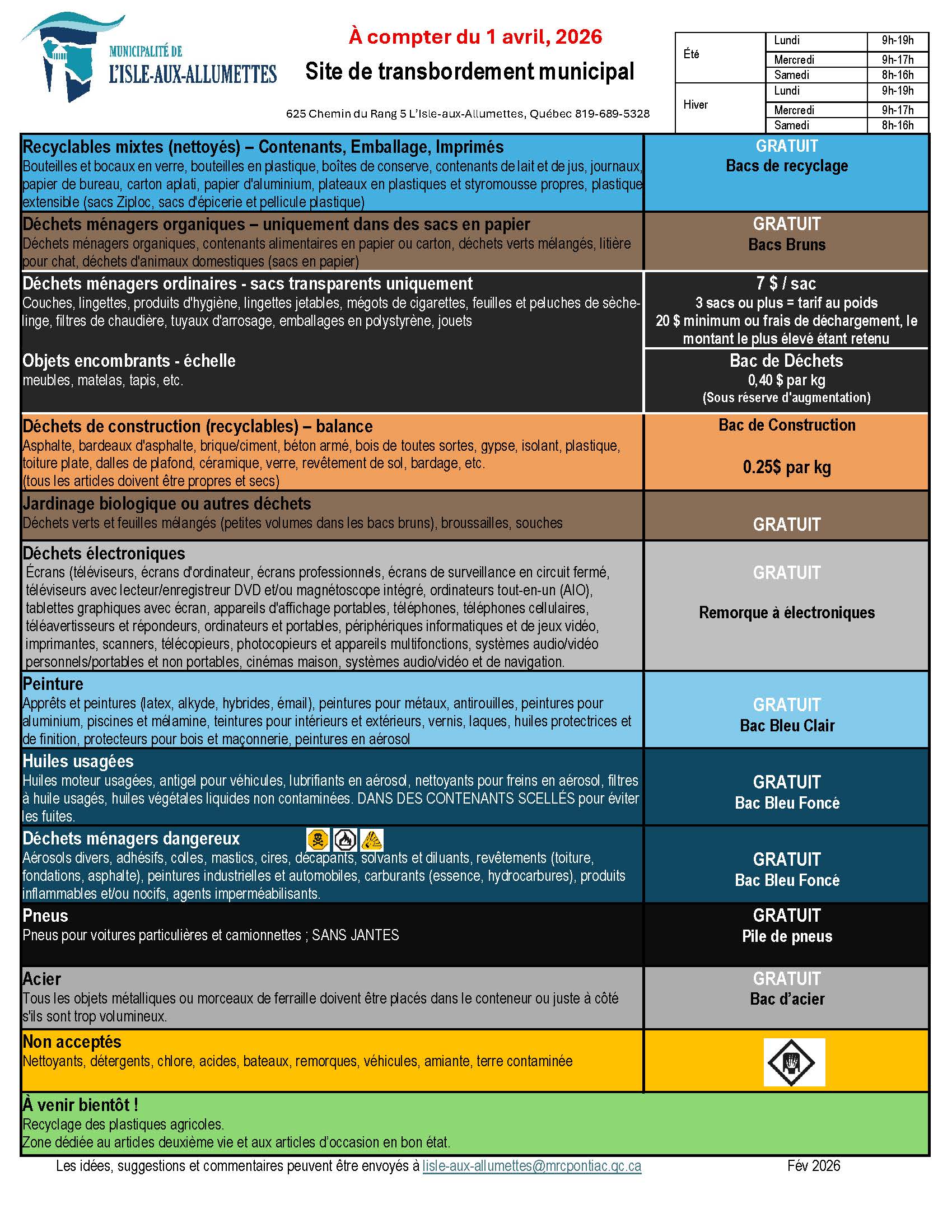 Le site de transfert continuera également d’accepter les électroménagers, appareils électroniques, peinture, huile usée, pneus, métal, et autres matières similaires gratuitement, comme par les années passées.